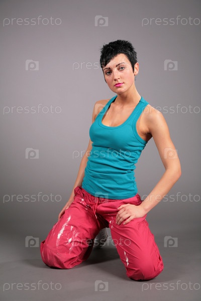 Женщина в спортивной одежде сидит на коленях