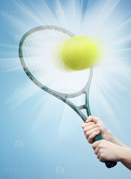 Теннисный мяч летит к ракетке на голубом фоне