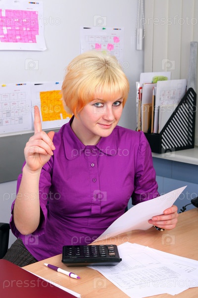 Девушка в офисе за столом с калькулятором