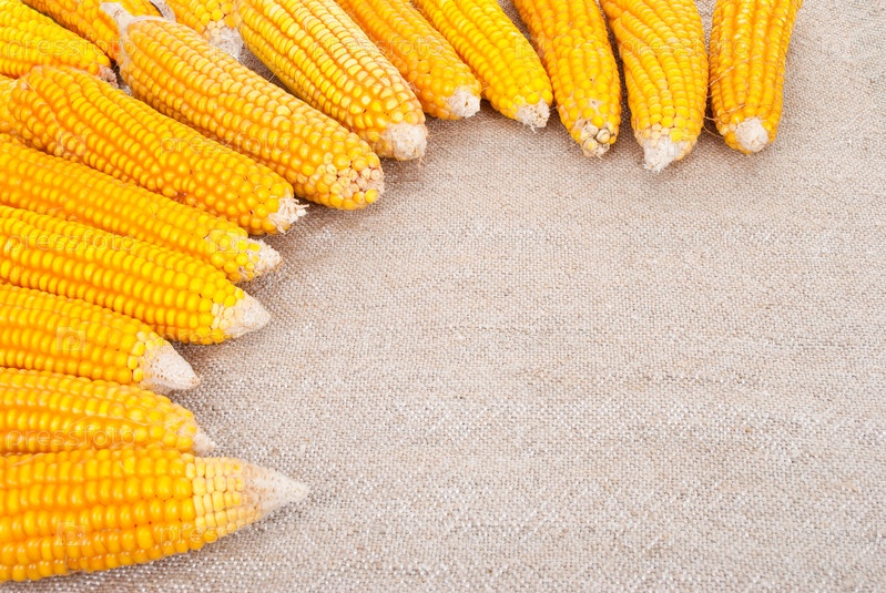 Спелые початки кукурузы на мешковине