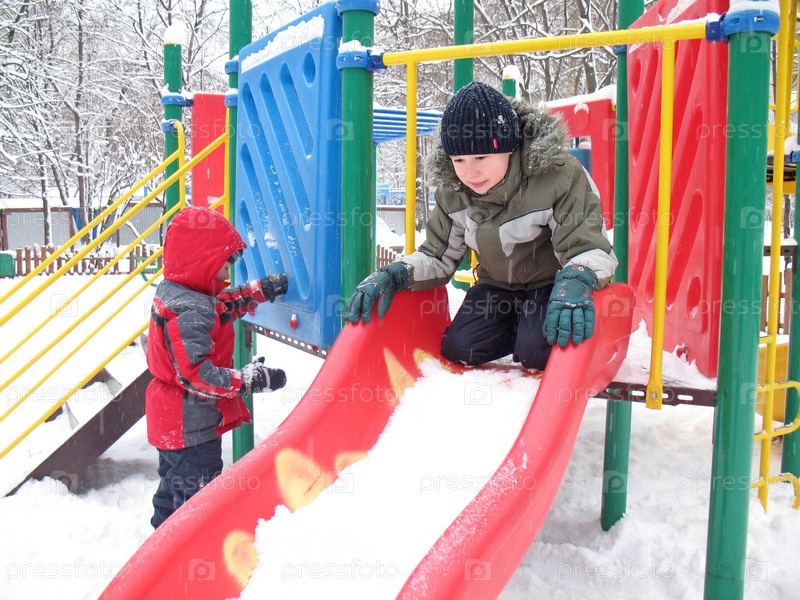 Двое маленьких мальчиков на детской игровой площадке зимой