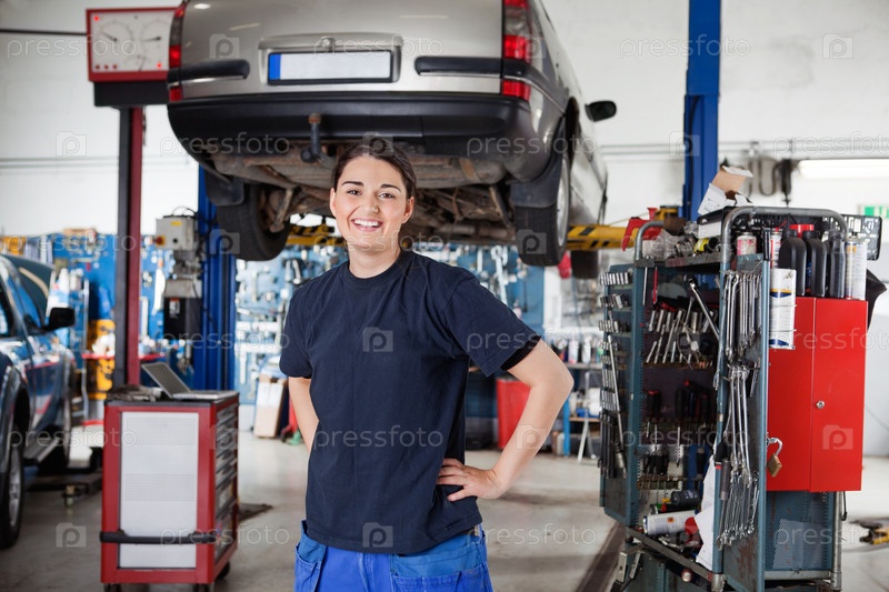 Улыбающаяся женщина-механик в гараже
