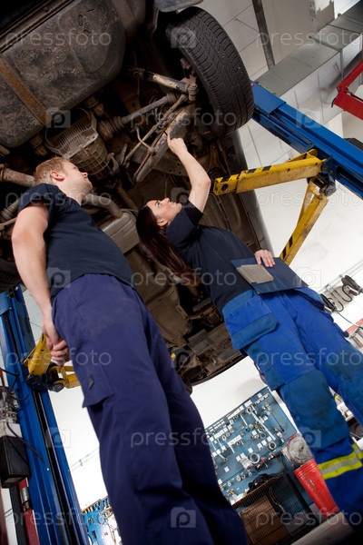 Два механика смотрят на автомобиль