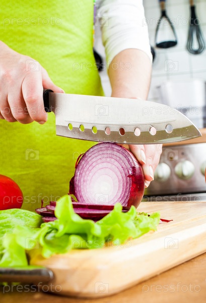 Женщина режет лук