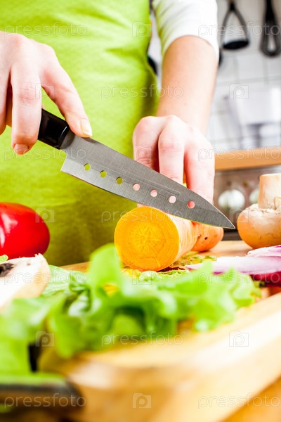 Женщина режет морковь