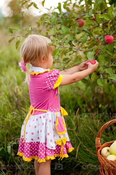 Маленькая девочка собирает яблоки, 2,5 года