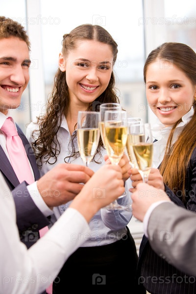 Фото счастливых друзей, держащих полные бокалы шампанского и улыбающихся во время вечеринки