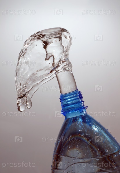 Движение воды вверх из бутылки на сером фоне