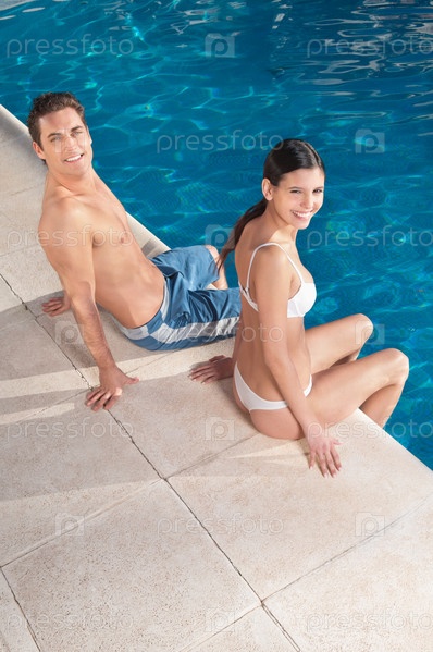 Красивая молодая пара отдыхает у бассейна