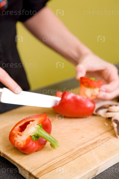 Женщина режет красный перец