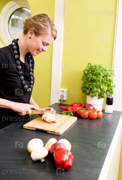 Женщина режет овощи на кухне