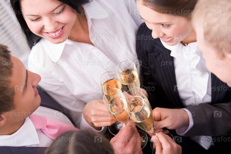 Фото счастливых друзей, держащих полные бокалы шампанского во время вечеринки