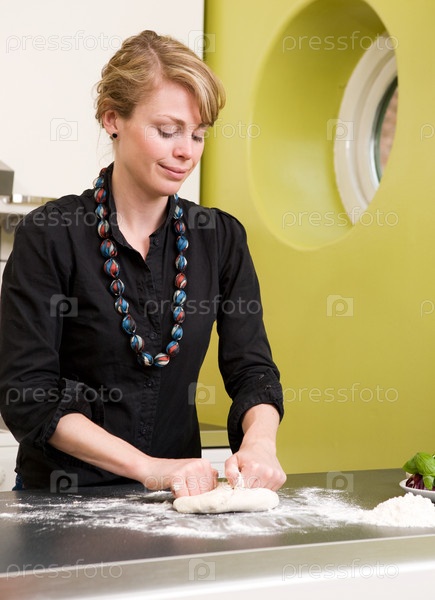 Молодая женщина делает тесто для пиццы