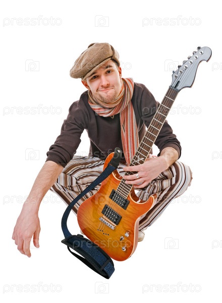 Веселый молодой музыкант с электрогитарой на белом фоне