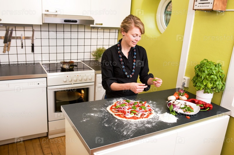Молодая женщина готовит пиццу