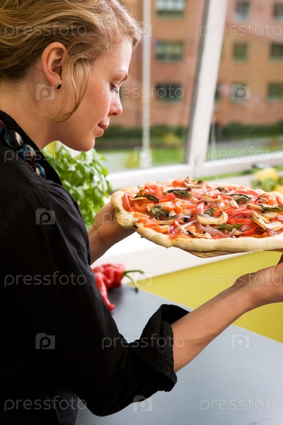 Молодая женщина с свежей пиццей