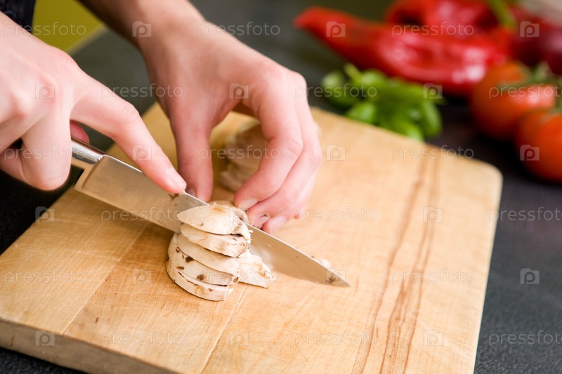 Женщина режет грибы
