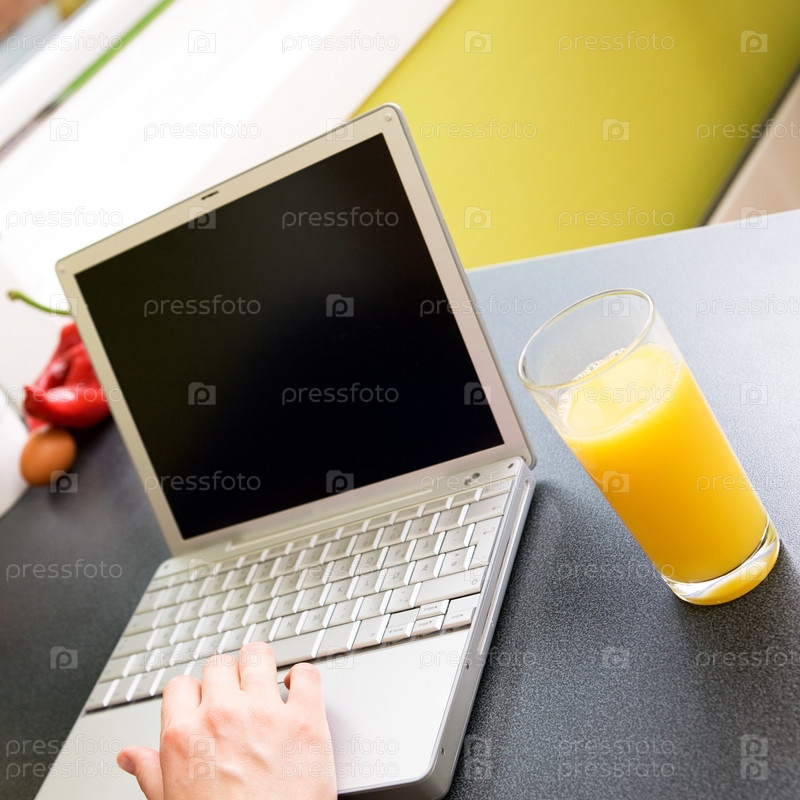 Ноутбук и стакан апельсинового сока