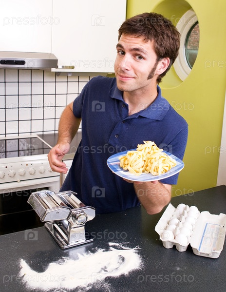 Повар с тарелкой свежей пасты феттуччине