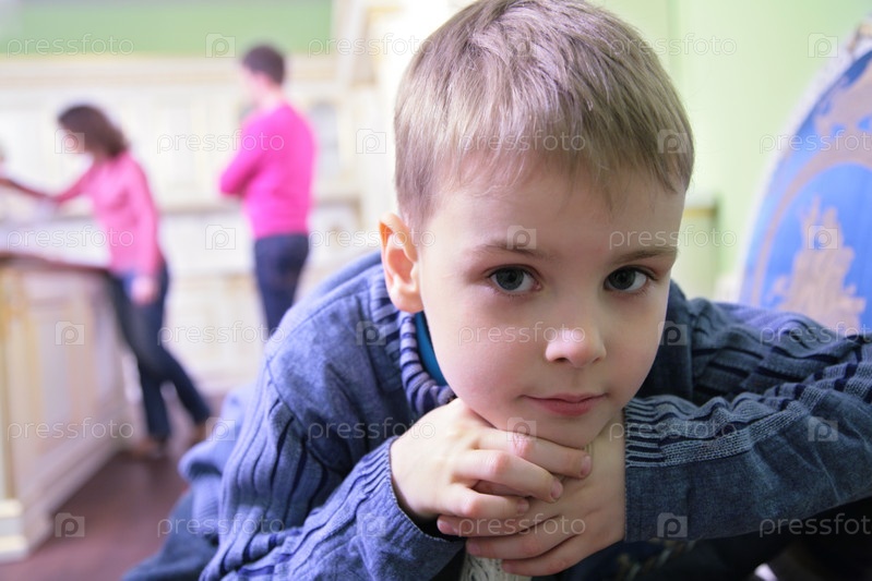 Портрет задумчивого ребенка на кухне на фоне родителей