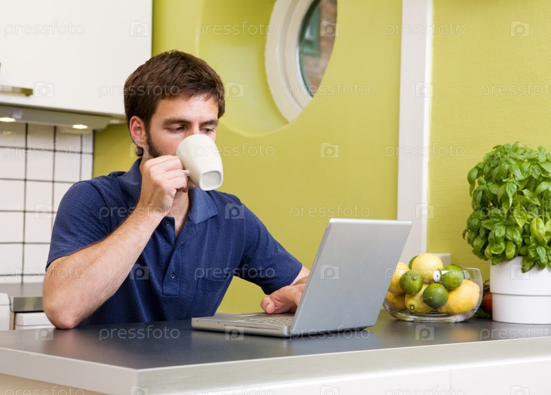Молодой человек с ноутбуком на кухне
