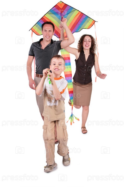 Сын и родители запускают разноцветного воздушного змея