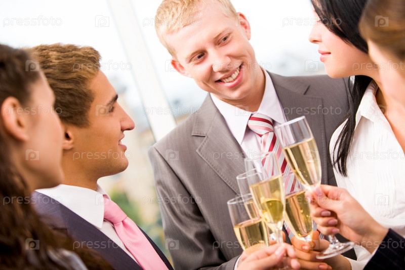 Фото счастливого мужчины, держащего флейту с шампанским и улыбающегося коллегам во время вечеринки