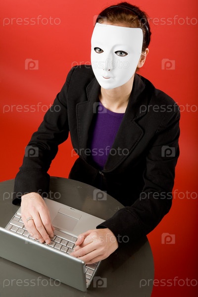 Молодая девушка в маске с ноутбуком