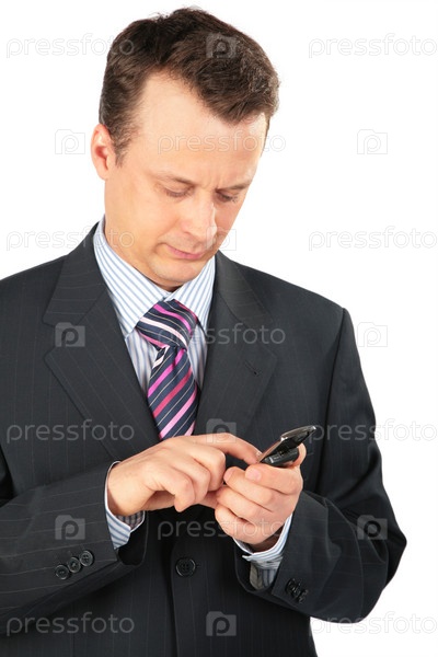 Бизнесмен набирает номер на сотовом телефоне на белом фоне