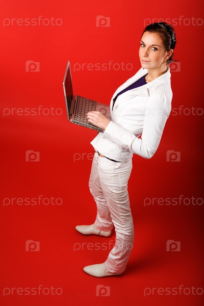 Девушка с компьютером на красном фоне