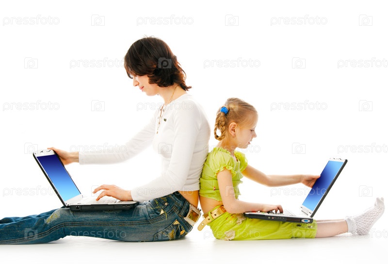 Женщина и ребенок с ноутбуками на белом фоне