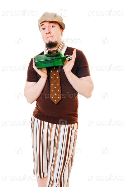 Молодой человек с зеленой бутылкой на белом фоне
