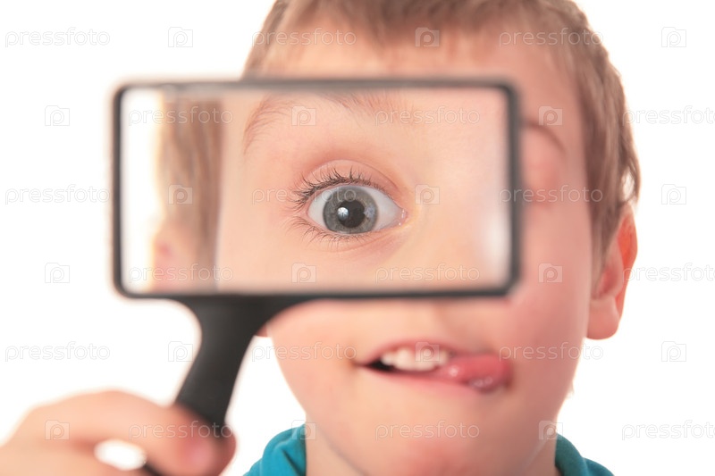 Мальчик смотрит через лупу с интересом