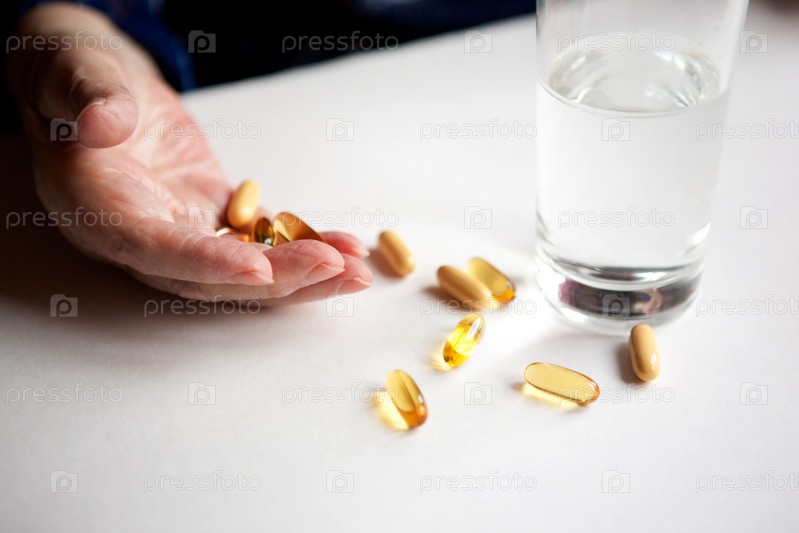 Капсулы с лекарством в руке пожилого человека