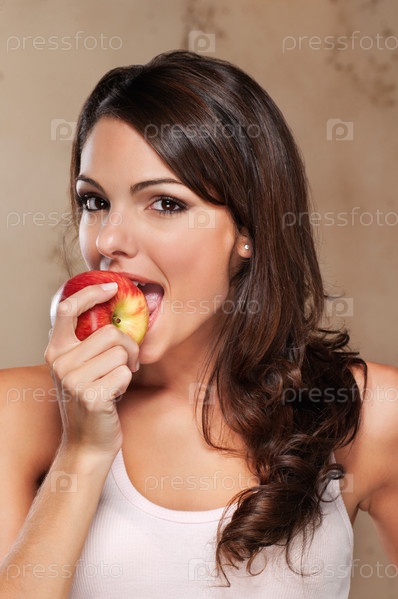 Красивая молодая женщина ест яблоко