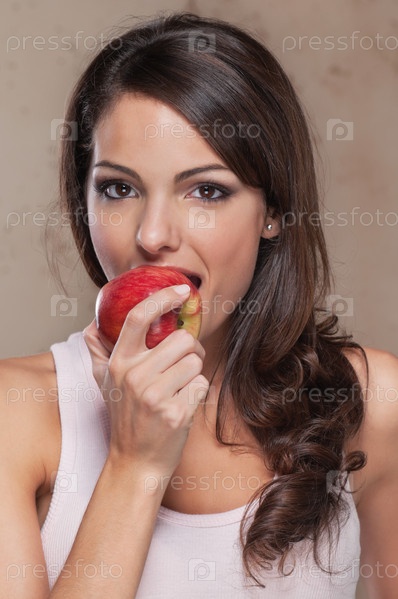 Красивая молодая женщина ест яблоко