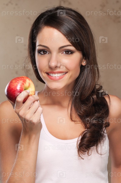 Улыбающаяся молодая женщина с яблоком
