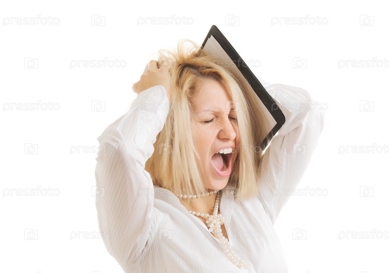 Стресс девушки предпринимателя, на белом фоне
