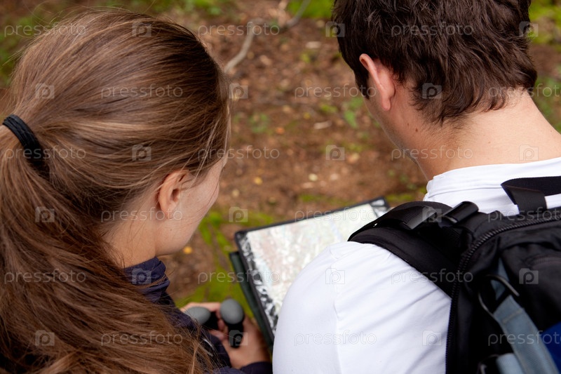 Молодая пара туристов с рюкзаками и картой