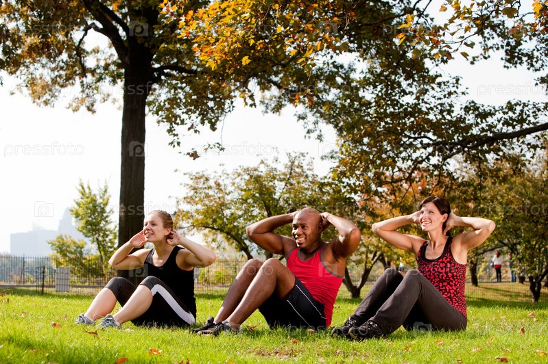 Друзья занимаются фитнесом в парке