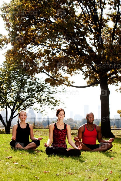 Друзья занимаются йогой в парке