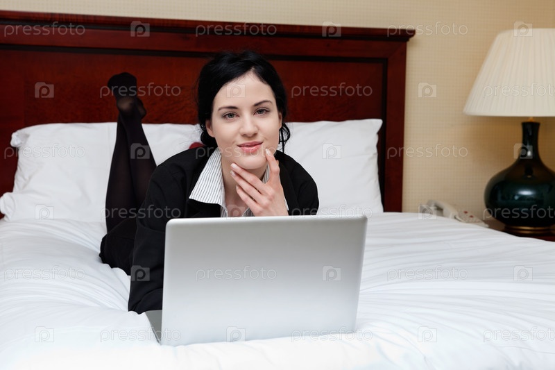 Бизнес-леди лежит на кровати с ноутбуком