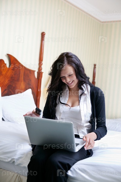 Бизнес-леди на кровати с ноутбуком