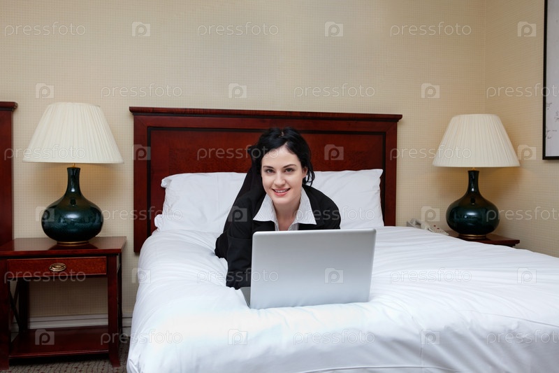 Бизнес-леди на кровати с ноутбуком