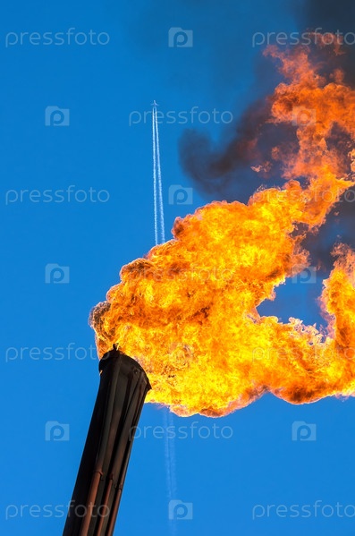 Нефтяной факел с самолетом в небе