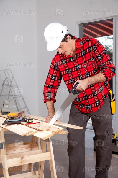Мужчина пилит доску
