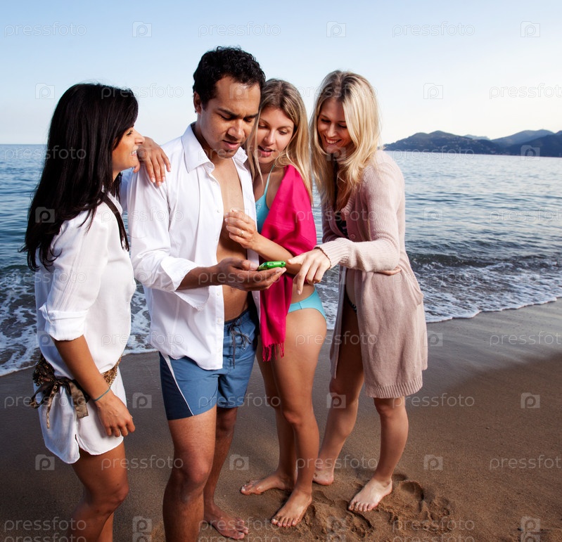 Друзья смотрят на телефон на пляже