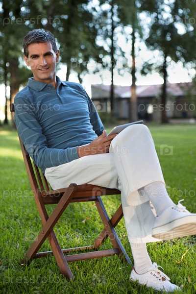 Мужчина держит планшетный компьютер