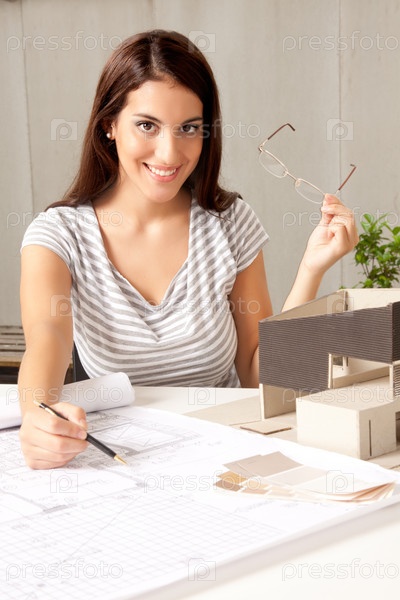 Архитектор с моделью дома и чертежами