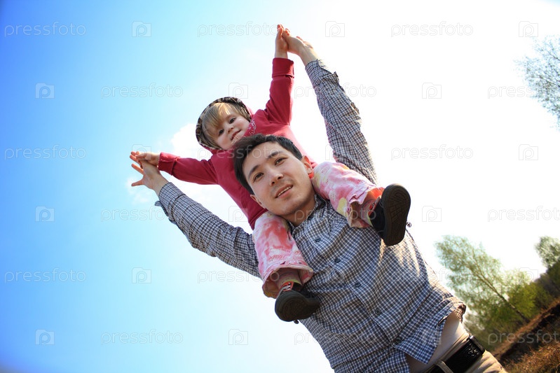 Дочка сидит на плечах отца на фоне неба